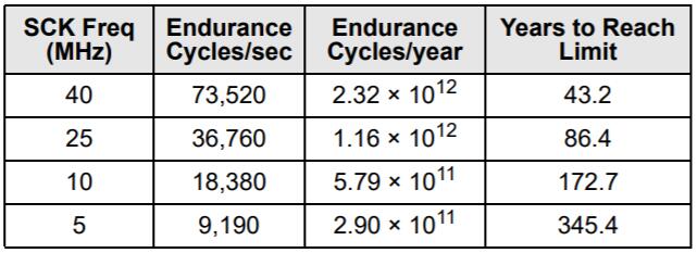 FeRAM存儲(chǔ)器具有讀取和還原機(jī)制。因此,對(duì)于存儲(chǔ)陣列的每次訪問(wèn)(讀取或?qū)懭耄瑢葱惺┘幽途弥芷凇?FRAM體系結(jié)構(gòu)基于每個(gè)64位的16K行的行和列的陣列。整個(gè)行在內(nèi)部訪問(wèn)一次,無(wú)論是讀取還是寫(xiě)入一個(gè)字節(jié)或全部八個(gè)字節(jié)。在耐久性計(jì)算中,該行中的每個(gè)字節(jié)僅被計(jì)數(shù)一次。下圖顯示了一個(gè)64字節(jié)重復(fù)循環(huán)的耐久性計(jì)算,該循環(huán)包括一個(gè)操作碼,一個(gè)起始地址和一個(gè)順序的64字節(jié)數(shù)據(jù)流。這將導(dǎo)致每個(gè)字節(jié)在整個(gè)循環(huán)中經(jīng)歷一個(gè)持久周期。即使在40 MHz時(shí)鐘速率下,F(xiàn)RAM的讀寫(xiě)持久性實(shí)際上也是無(wú)限的。