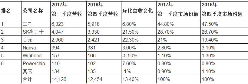 根據(jù)Trendforce公司旗下DRAMeXchange事業(yè)部公布的最新統(tǒng)計(jì)數(shù)據(jù)顯示,在2017年首季中,內(nèi)存組件的整體銷(xiāo)售額達(dá)到刷新紀(jì)錄的141億美元,較上年同期增長(zhǎng)達(dá)13.4%。