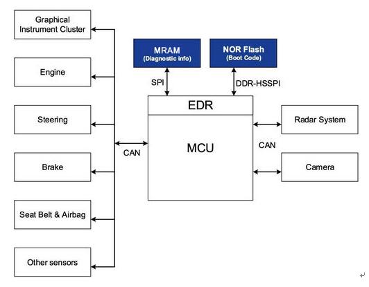 EDR 通過測量汽車前部壓力傳感器的撞擊力、車速、發動機轉速、轉向輸入、油門位置、制動狀態、安全帶狀態(檢測乘客)、輪胎氣壓、警告信號以及安全氣囊打開狀態,從而判斷碰撞嚴重程度。并且在汽車碰撞前和碰撞期間記錄以上數據。顯然,微控制器不能等到事故發生才開始記錄數據。因此,微控制器需要連續存儲數據。所以,EDR 需要一個具有幾乎無限寫次數的非易失性存儲器。