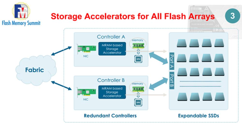在全閃存陣列的存儲控制器中,MRAM可以作為緩存加速,并提升產品性能及可靠性,同時可以不需要額外的電池或者電容。