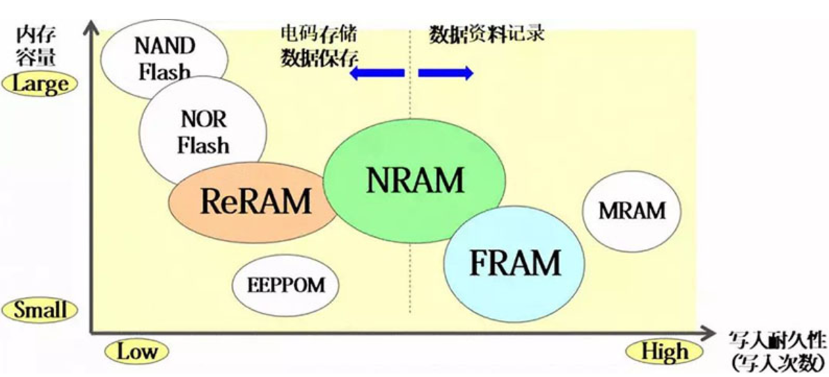 MRAM和ReRAM)都更貼近通用性存儲器。他們一般用于更換閃存芯片,因而NRAM在理論上既能夠更換DRAM,還可以更換閃存芯片。