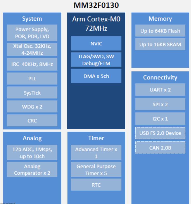 上海靈動微電子通用MCU MM32F0130擁有M0內核的高性能的32位微控制器,工作頻率可達72兆赫茲,并內置高速flash存儲器,具有增強型I/O端口和外設連接到外部總線。其工作電壓為2.0V~5.5V,常規型環境工作溫度范圍-40?C∼85?C和擴展型溫度范圍-40?C∼105?C。且多種省電工作模式保證低功耗應用的要求。