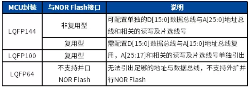 MM32F3270系列MCU因為封裝的原因,導致只有部分MCU產品可以通過硬件復用出全部或部分的FSMC接口的相關GPIO;外擴NOR Flash也只有使用 LQFP144引腳封裝MCU芯片才能支持連接地址數據非復用和復用方式外擴并行NOR Flash;而LQFP100引腳封裝芯片因地址線縮減,僅支持連接地址數據復用方式外擴并行NOR Flash。LQFP64因為無法引出足夠的地址與數據總線,同樣不支持外擴并行NOR Flash。目前市場上非復用型16位數據總線接口的NOR Flash也是較為普遍。