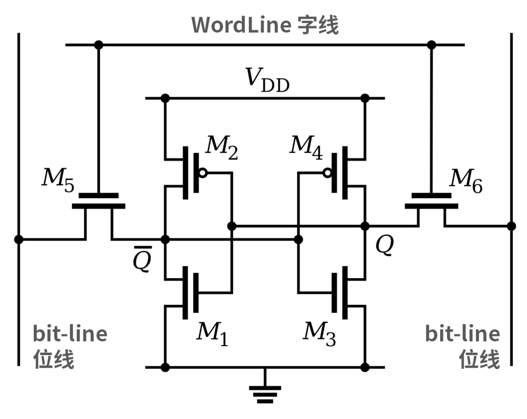 SRAM的基本單元,則最少由6管晶體管組成:4個場效應管(M1,M2,M3,M4)構成兩個交叉耦合的反相器,2個場效應管(M5,M6)用于讀寫的位線(BitLine)的控制開關,通過這些場效應管構成一個鎖存器(觸發器),并在通電時鎖住二進制數0和1。因此,SRAM被稱為“靜態隨機存儲器”。