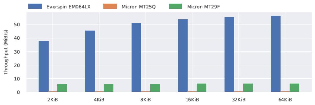 對于每個芯片,讀取/寫入64MiB的數(shù)據(jù),從地址0開始,到地址8388608(8MiB)結束。我們對各種訪問大小重復該過程:2KiB、4KiB、8KiB、16KiB、32KiB和64KiB。在閃存中,每個塊在寫入第一頁之前都會被擦除。擦除時間包括在寫入吞吐量測量中。