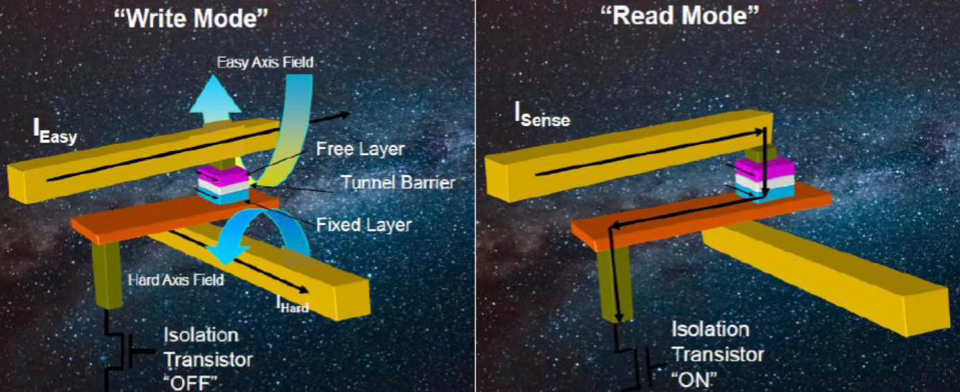 MRAM或磁性隨機存取存儲器使用具有鐵磁性材料的磁性“狀態”的1晶體管–1磁性隧道結(1T-1MTJ)體系結構作為數據存儲元素。由于MRAM使用磁性狀態進行存儲(而不是隨時間推移而“泄漏”的電荷),因此MRAM提供了相當長的數據保留時間(+20年)和無限的耐用性。切換磁極化(寫入周期)是在電磁隧道結(MTJ)上方和下方的導線中產生脈沖電流的結果(見圖1)。電流脈沖產生的相關H場改變了鐵磁材料自由層的極化,這種磁開關不需要原子或電子的位移,這意味著沒有與MRAM相關的磨損機制。自由層相對于固定層的磁矩改變了MTJ的阻抗(見圖2)。阻抗的這種變化表示數據的狀態(“1”或“0”)。通過測量MTJ的阻抗來實現傳感(讀取周期)(圖3)。MRAM器件中的讀取周期是非破壞性的,并且相對較快(35ns)。讀取操作是通過在MTJ兩端施加非常低的電壓來完成的,從而在部件壽命內支持無限的操作。